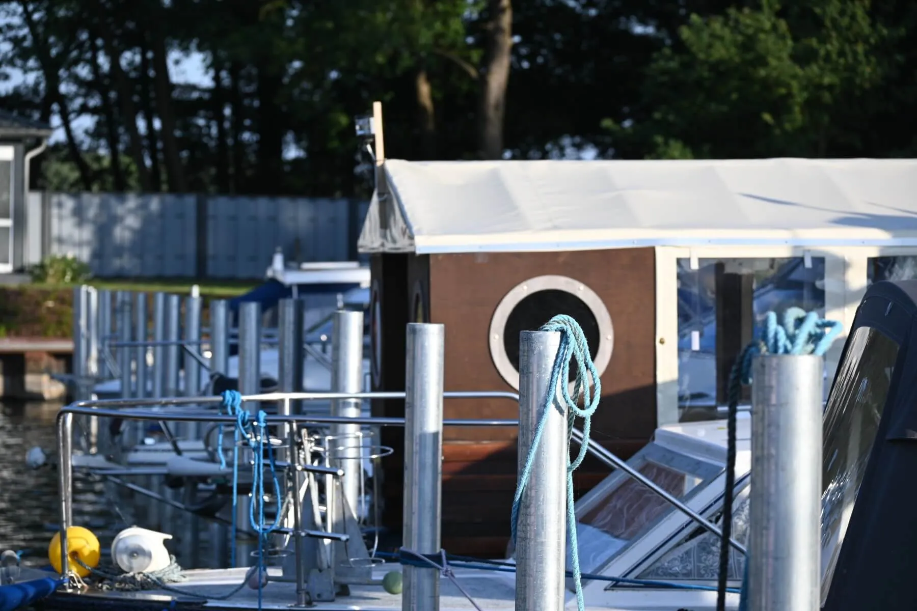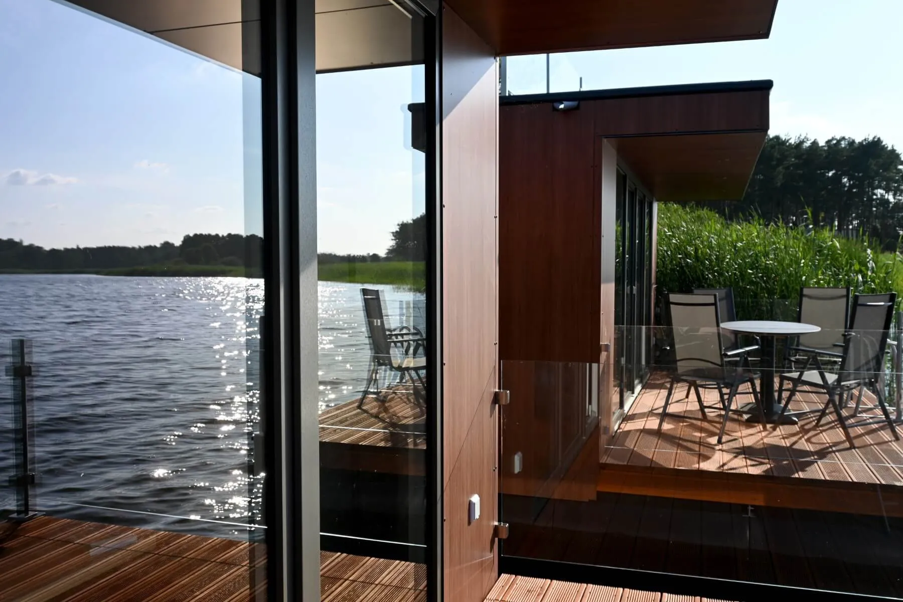 Urlaub auf dem Hausboot. Eine kleine schwimmende Wohnlandschaft direkt am Ufer des Hohennauener-Ferchesarer See´s umgeben von Wäldern in komfortabler wohnlicher Atmosphäre.